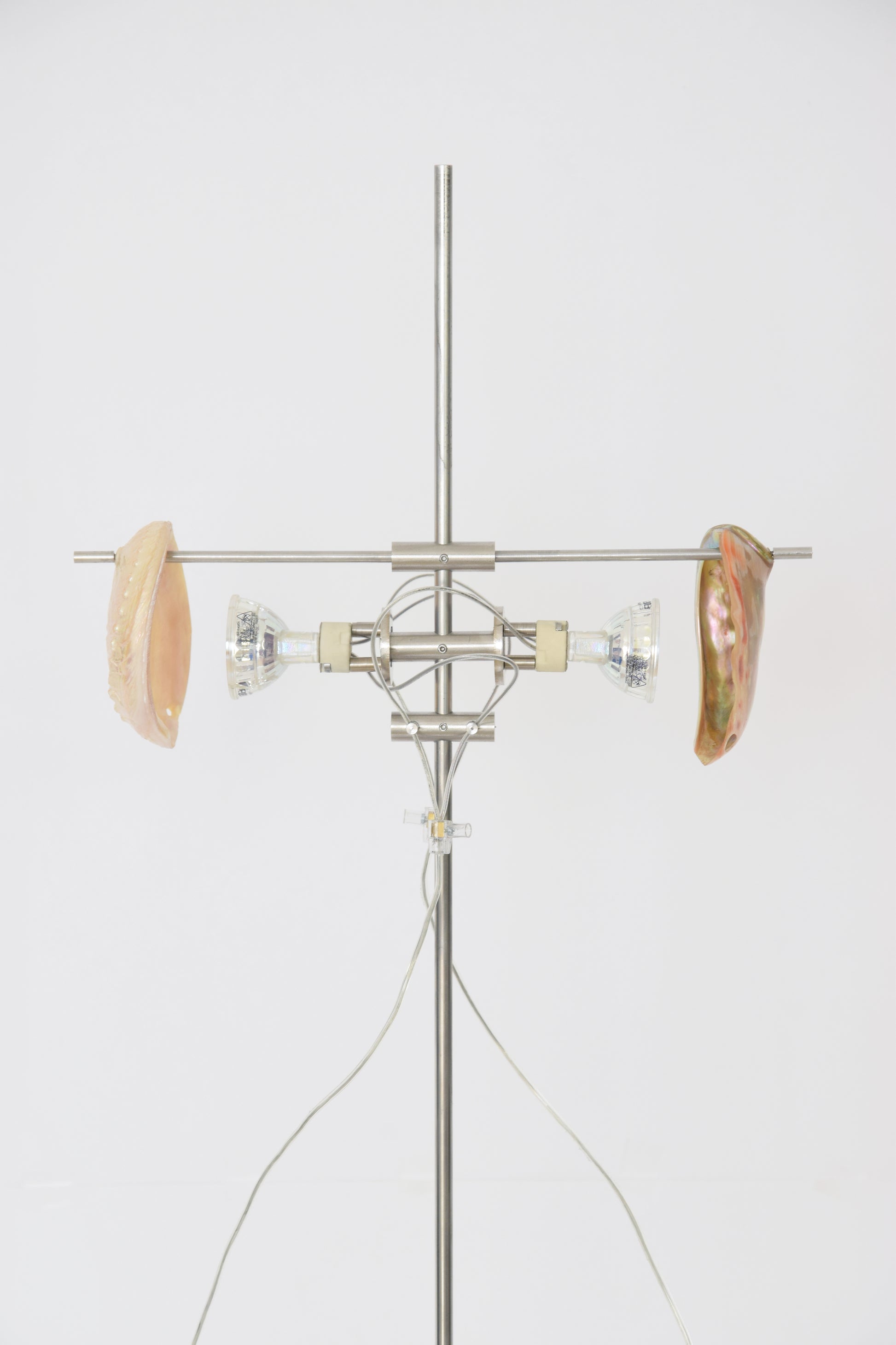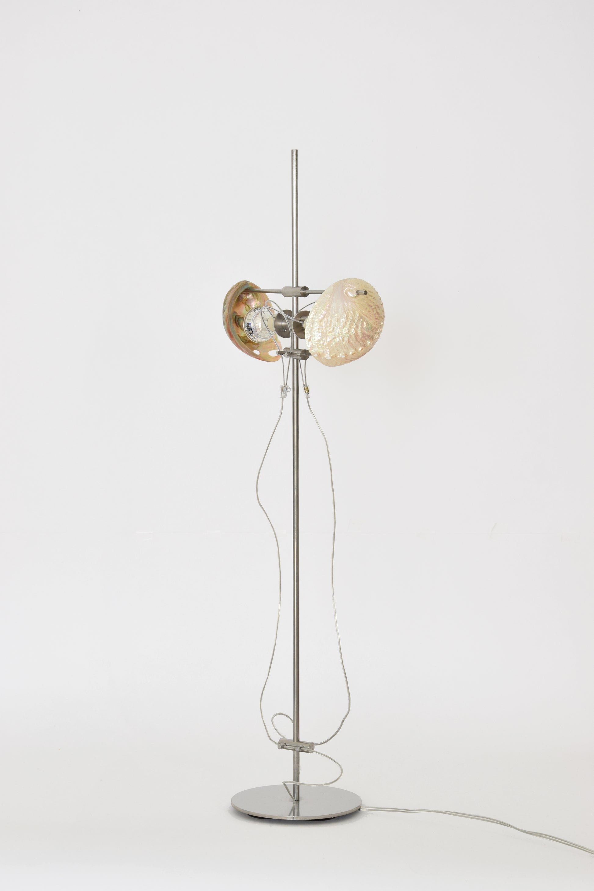MADRE is a series of lamps conceived and designed by Ludovico Grantaliano from a shell. Like a diffuser, the mother-of-pearl creates unique and unpredictable shades and colours. The other parts, steel and electrical wiring, on the other hand, have an almost brutalist mechanical appearance. MADRE seeks a balance and symbiosis between the natural and the artificial world, each lamp is a unique piece.