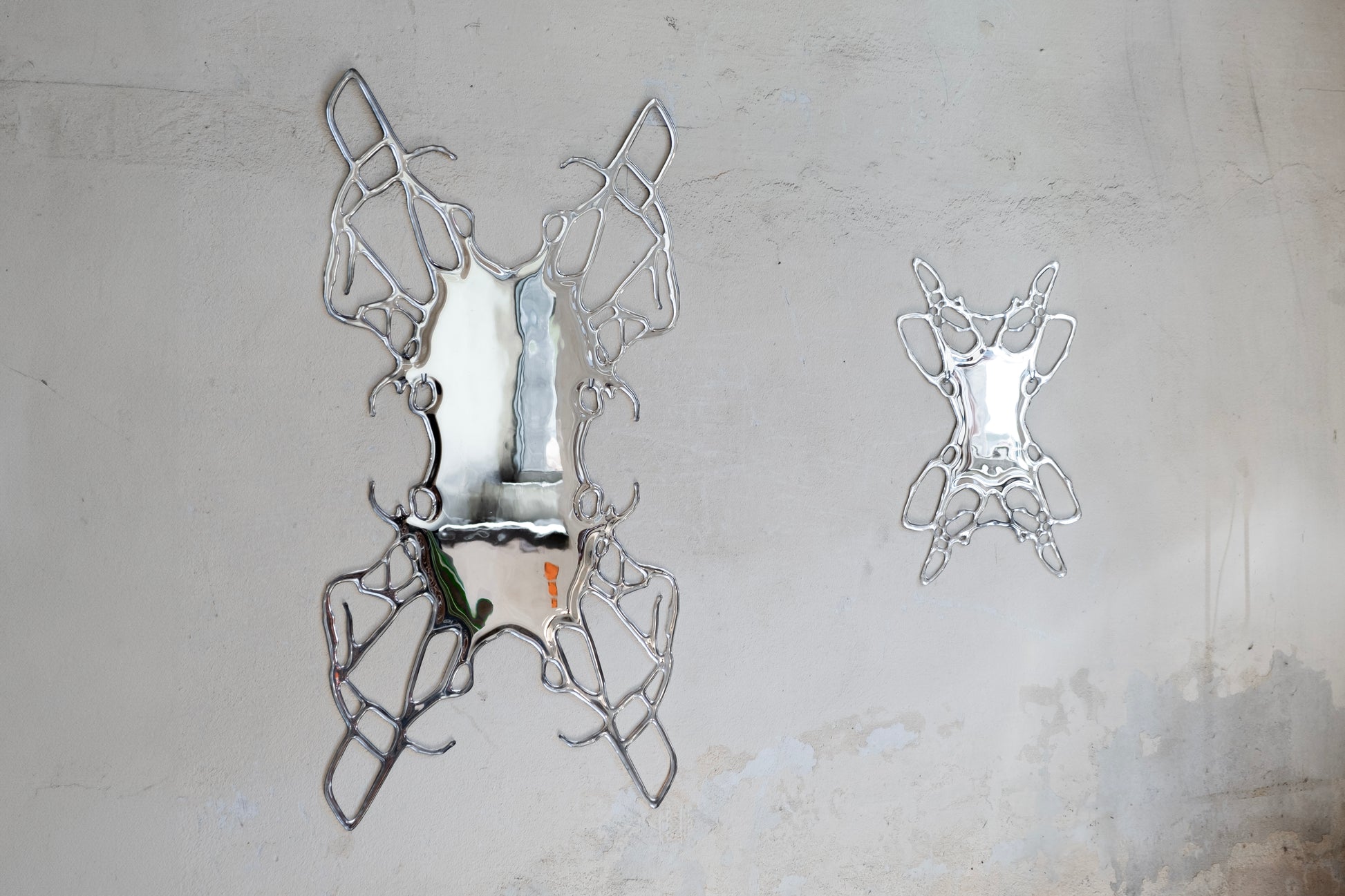 The mirror appears to be a metallic object but is in fact made of glass. Glass serves as a consistent element in Clara's practice, guiding her exploration of fluidity and permanence. The material becomes a stage where fleeting shapes are captured as intricate webs, framing the mirror’s reflection as unique interplays between distortion and definition. The hand-polished and silvered mirror fuses time-honored techniques with contemporary visions of seemingly digital interactions, which together create analog effects of collision and reflection.